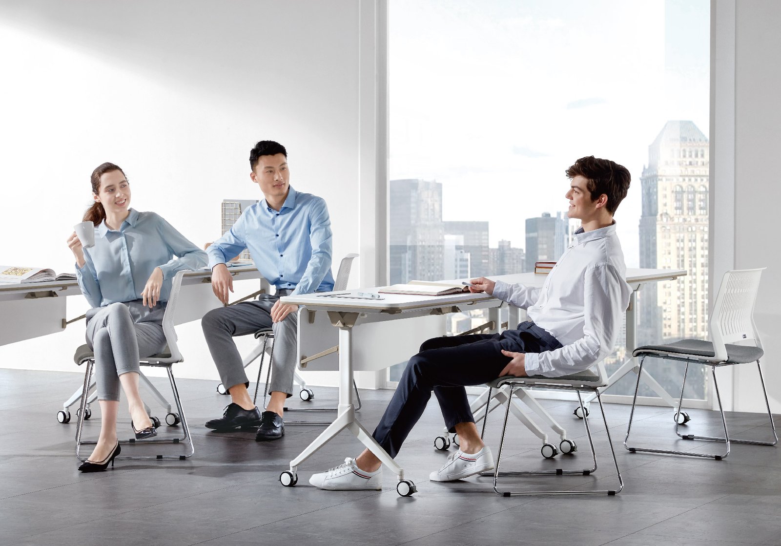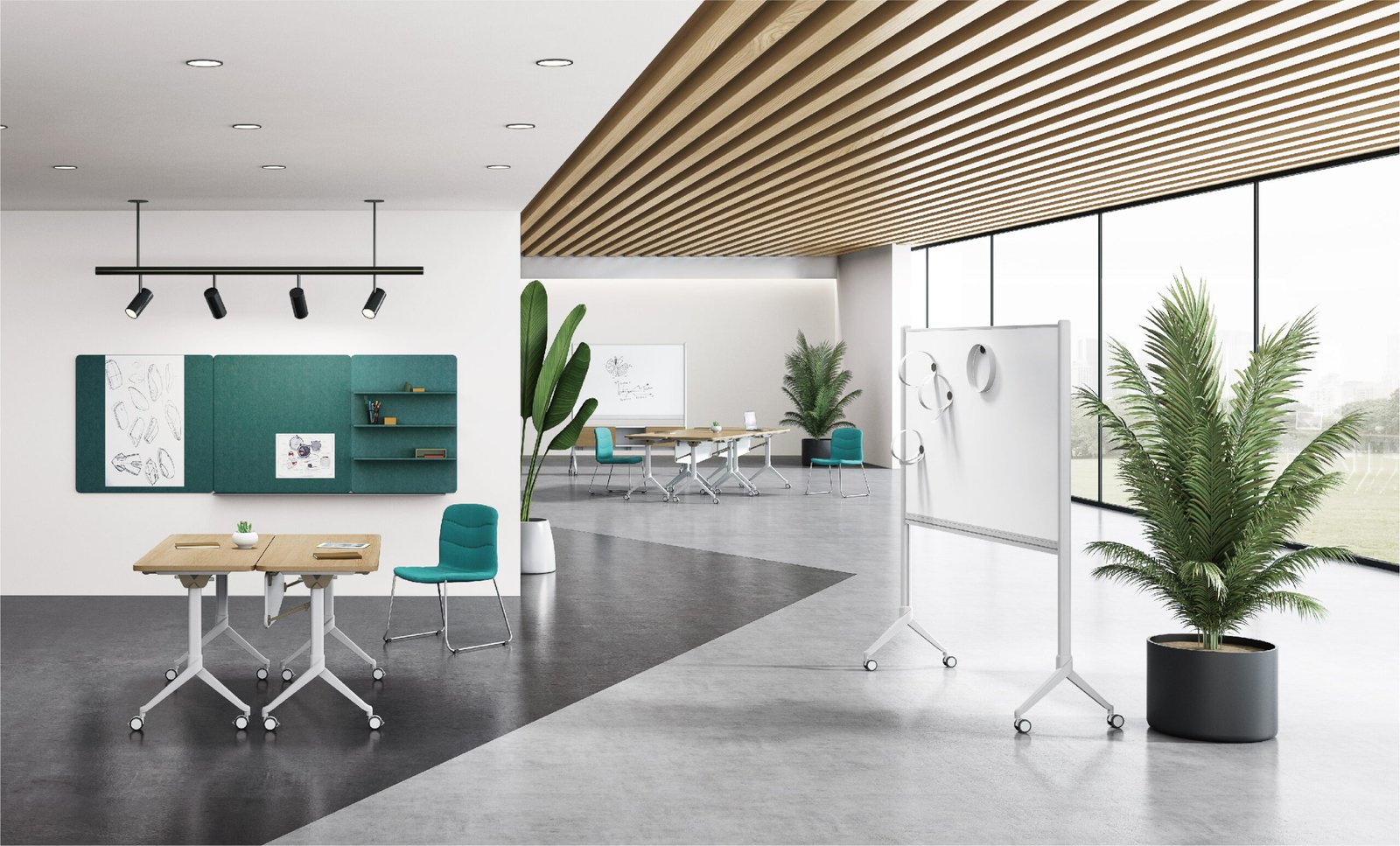 Mdecor brings together desks, cabinets, and whiteboards for efficient learning. The design of the feet takes inspiration from elegant ballet dancers and the chair is easy to move, thanks to omni-directional castors. Mdecor desks can be easily folded and stacked, saving more room for different training lessons.